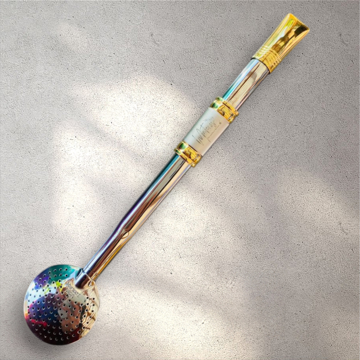 Bombilla Acero inoxidable marca «Materos»,tapa Rosca, largo 21 cms, bañada en Oro 24K, Tubo 9,53 mm.